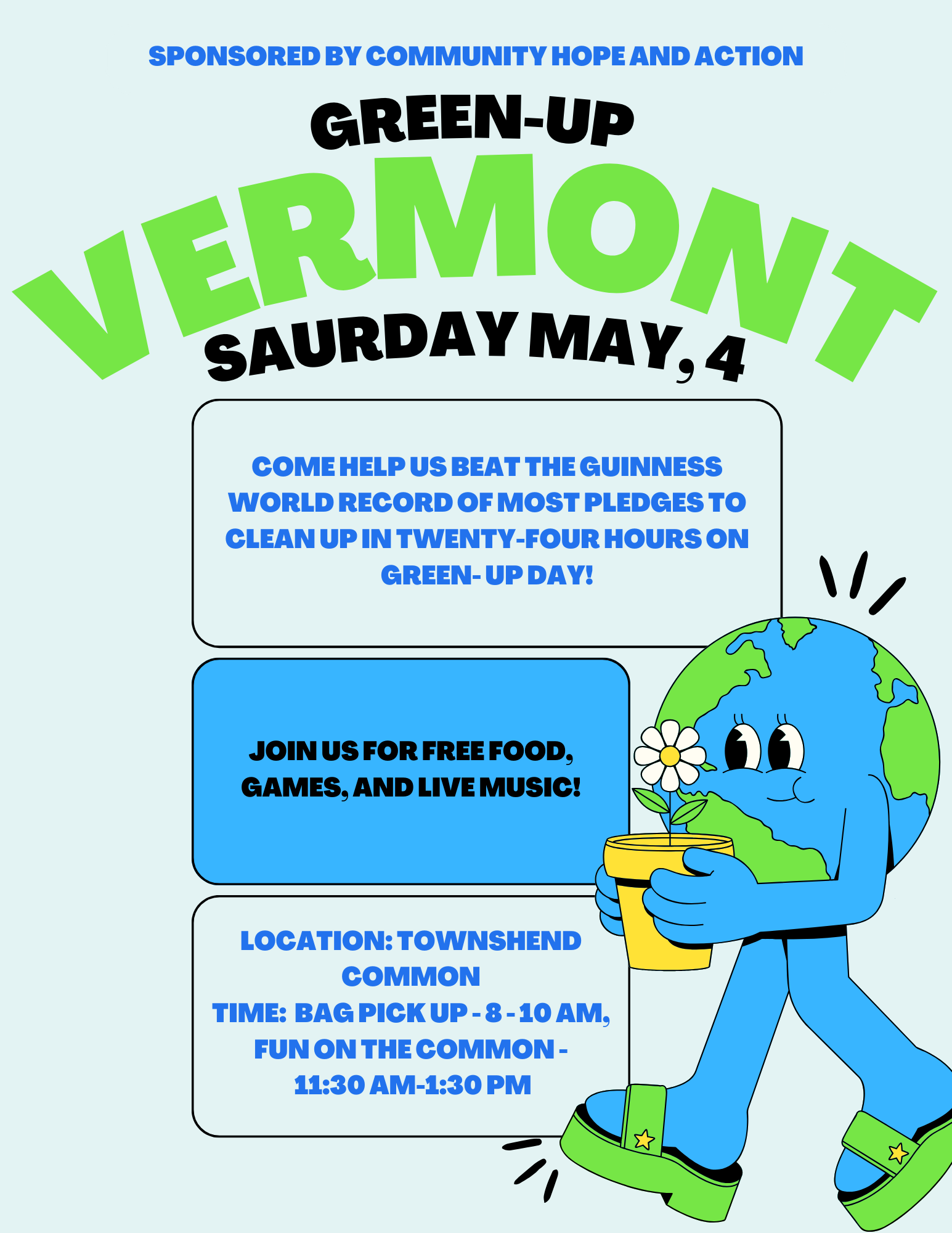 Students from Leland & Gray’s Project Based Learning Event Planning class and the Community Hope and Action Planning Committee are hosting a fun, family-friendly, Green Up Day event on Saturday, May 4, 2024 on the Townshend Common.